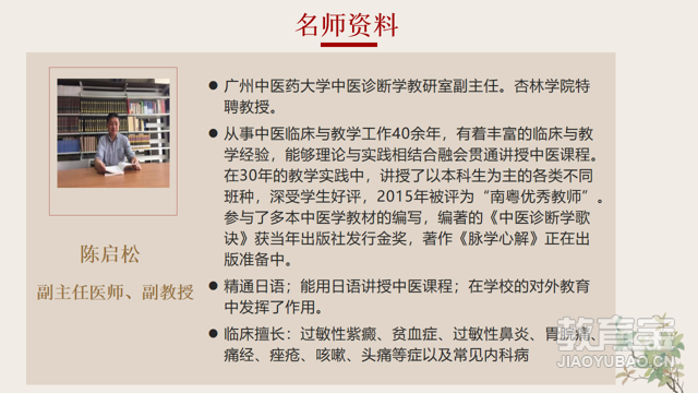 從事中醫(yī)臨床與教學(xué)工作40余年,有著豐富的臨床與教學(xué)經(jīng)驗(yàn),能夠理論與實(shí)踐相結(jié)合融會(huì)貫通講授中醫(yī)課程。在30年的教學(xué)實(shí)踐中,講授了以本科生為主的各類不同班種,深受學(xué)生好評(píng),2015年被評(píng)為“南粵優(yōu)秀教師”。參與了多本中醫(yī)學(xué)教材的編寫(xiě),編著的《中醫(yī)診斷學(xué)歌訣》獲當(dāng)年出版社發(fā)行金獎(jiǎng),著作《脈學(xué)心解》正在出版準(zhǔn)備中。