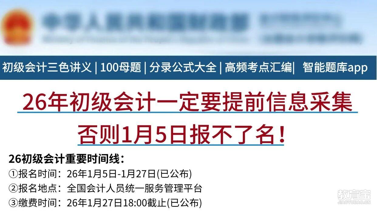 會計人注意啦!財政部剛發(fā)通知,2026年初級會計考試的事兒全定了!報名時間是2026年1月5日到1月27日——全國會計人員統(tǒng)一服務管理平臺開初級、高級報名入口。各省份自己定當?shù)亻_始時間,但1月27日12點截止報名,18點截止繳費。:1月26日12點前必須完成信息采集,不...